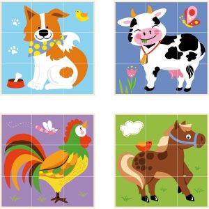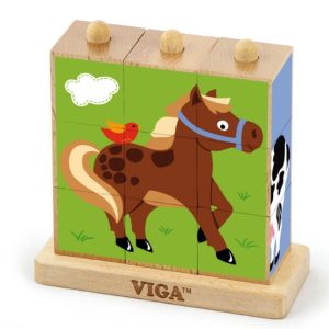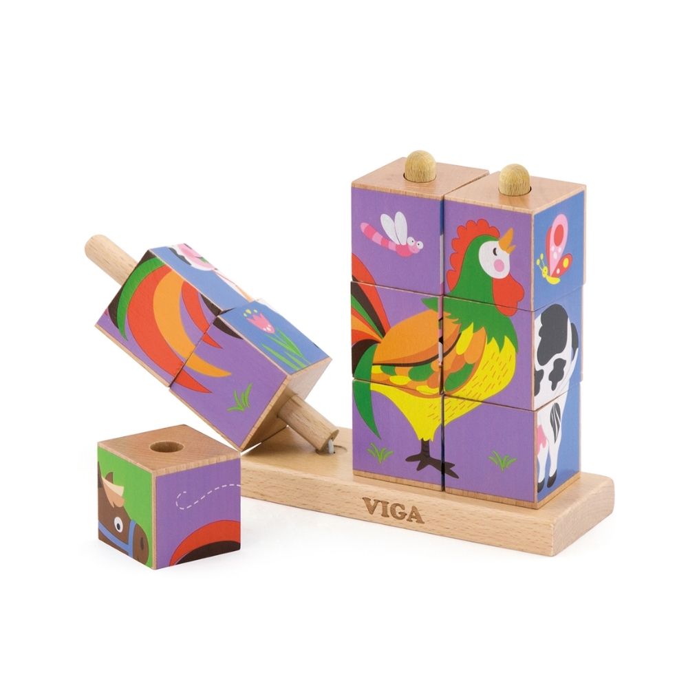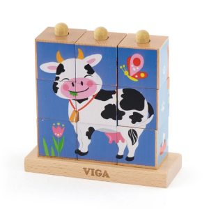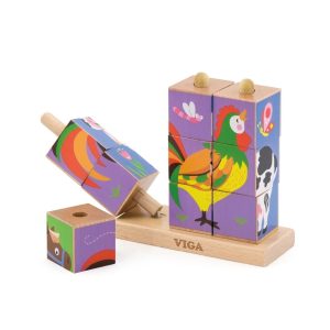 Children can easily build 4 pictures by stacking the 9 blocks, in assorted variations, on the verticle rods.